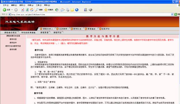 精品课程建设包含申报网站建设和网络课程建设,在网络课程中包含有教学资料库(教学大纲、教案、案例及试卷等)、课程的高质量多媒体课件、多媒体素材(收录各课程内容相关的图片、音频、视频和动画素材资源)、专业行业应用资源(收录维修资料、企业培训资料等)。学生既可以利用网络课程平台中的助学课件、教学录像等教学资源进行自学,又可以通过网络进行自我测试和与任课教师进行交流。网络平台的开放性和信息量大等特点,促使学生极大地提高了学习的积极性和主动性,扩大了学生的知识面。
