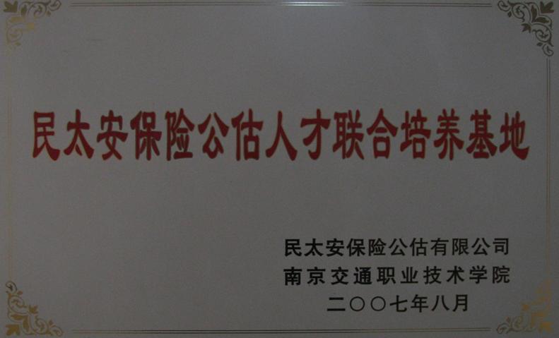 2007年5月,南京交通职业技术学院与民太安保险公估股份有限公司联合办学,共建“民太安保险公估人才联合培养基地”,成立了“民太安班”。公司每年指定专业技术人员担任“民太安班”指导老师,定期与学生沟通,协助学院对学生的培养过程进行管理。公司在我院专设“民太安奖学金”,激励民太安班学生刻苦学习,促使学生德、智、体全面发展。学院定向为公司培养汽车事故定损及理赔技术人才。