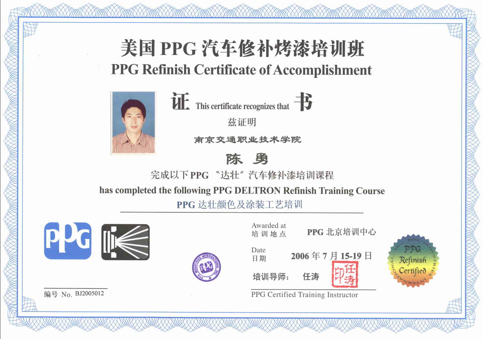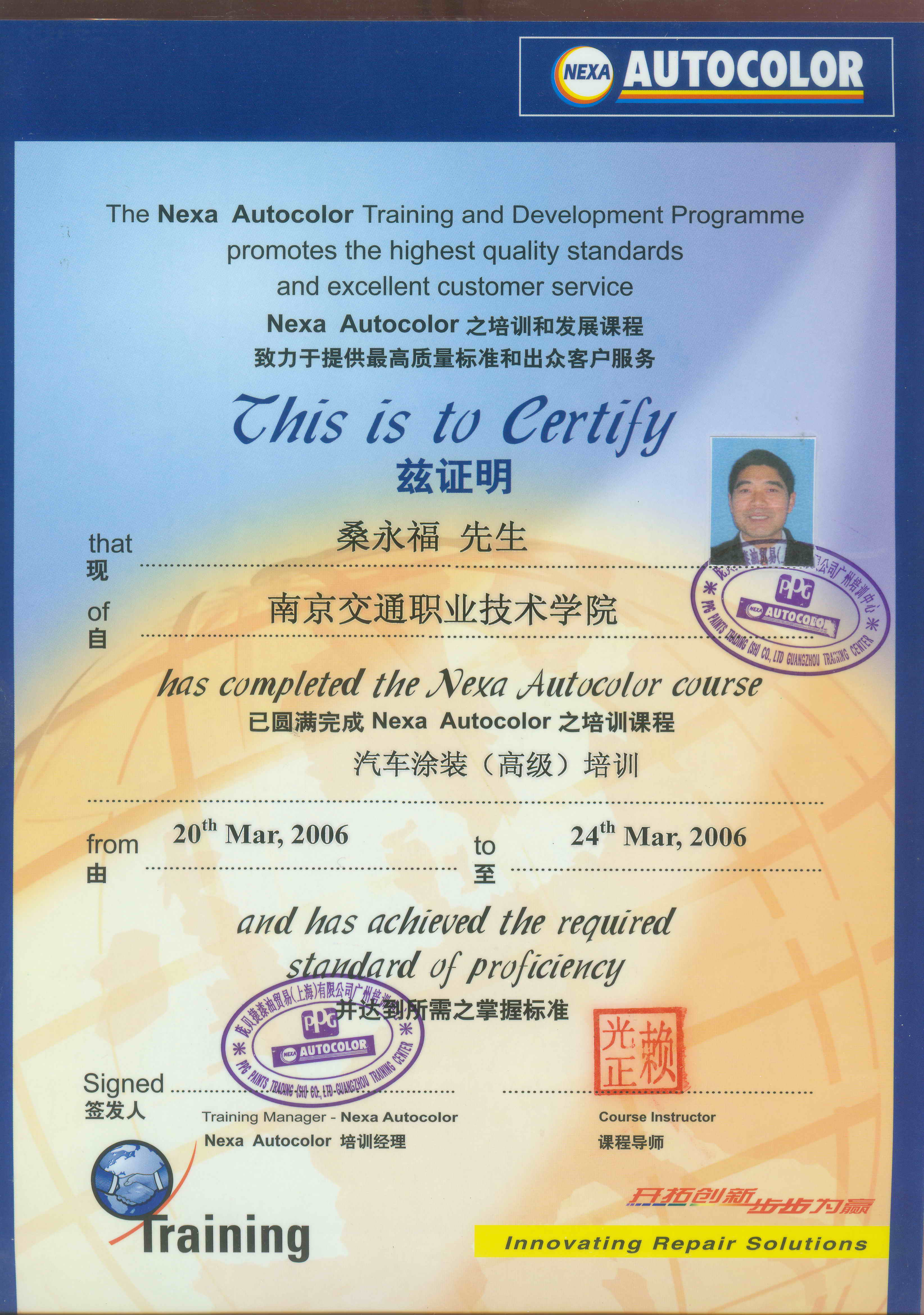 先后有汤其国、陈勇、谢剑、桑永福4名教师接受PPG公司涂装培训,通过培训使教师提高了实践技能,并及时掌握了汽车涂装方面的最新知识。
