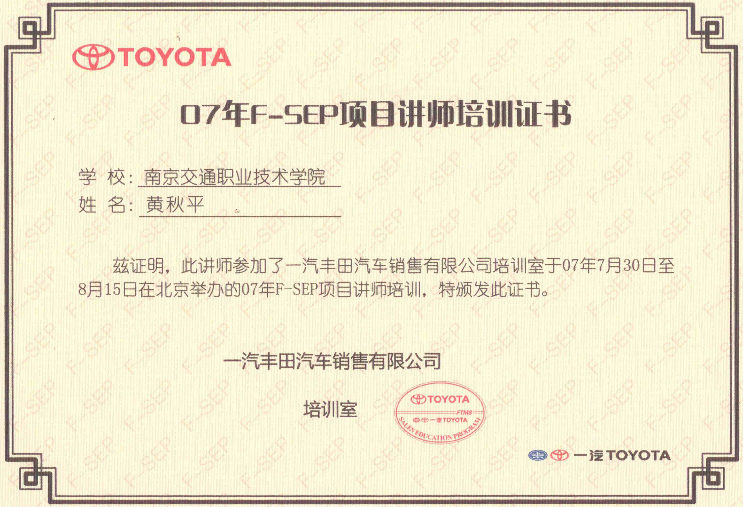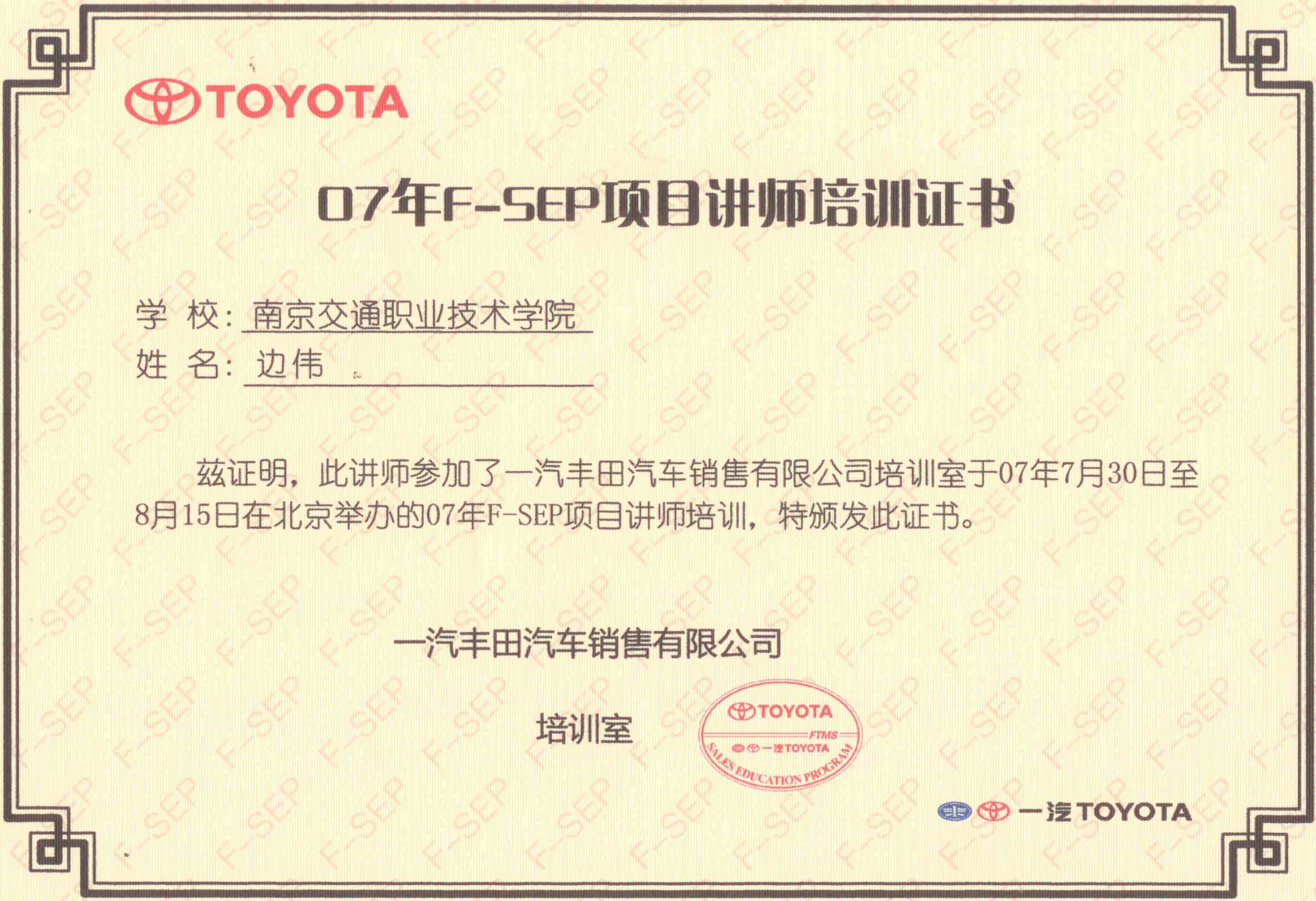 边伟、黄秋平2名教师到一汽丰田销售公司接受销售顾问培训,已获得丰田F-SEP培训教师资格。