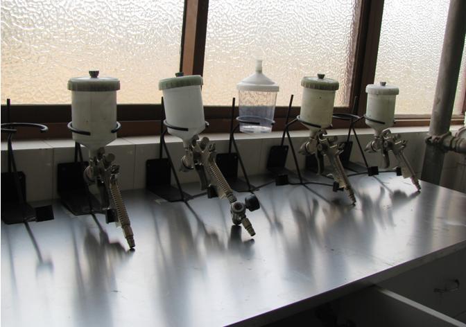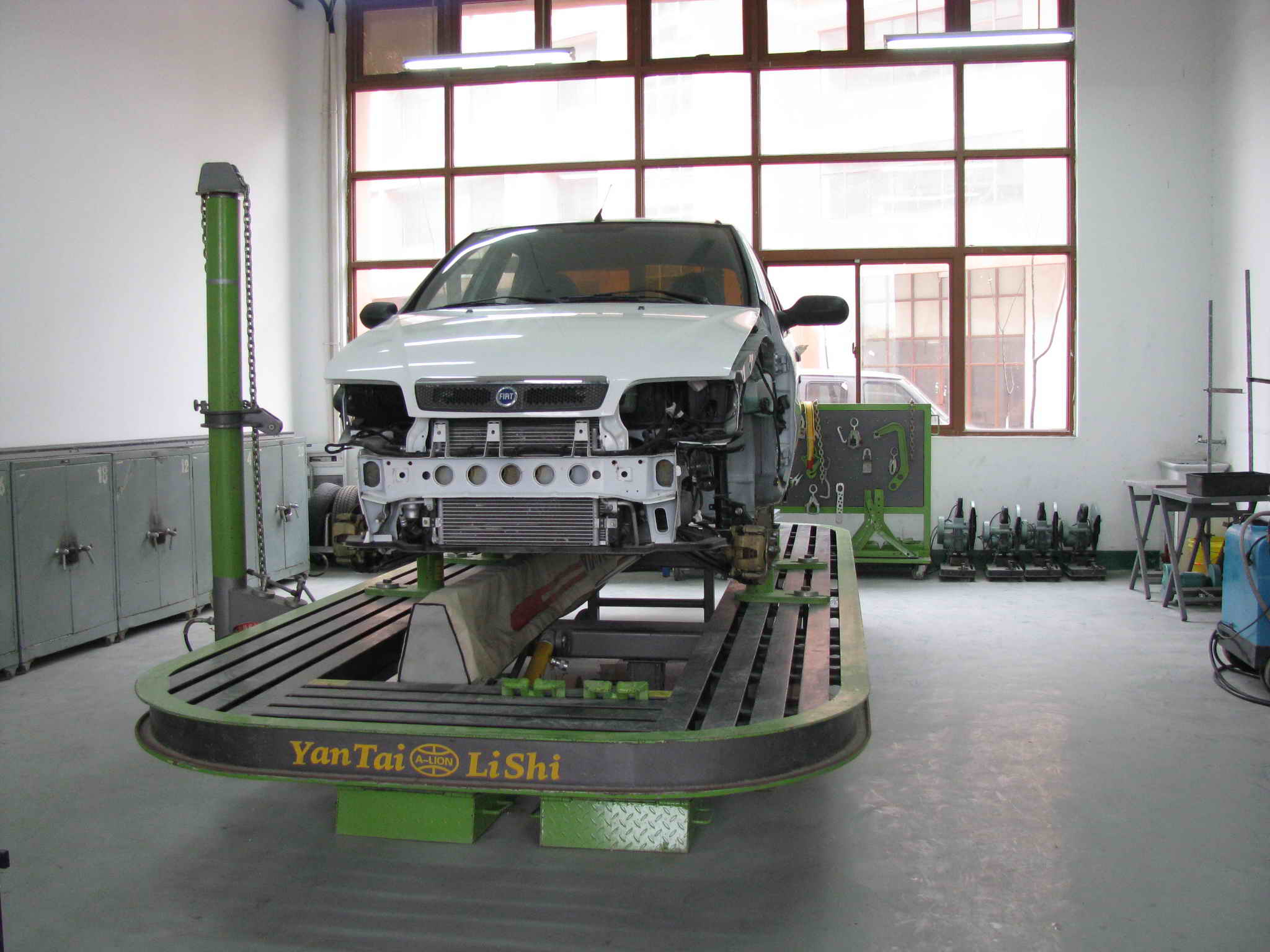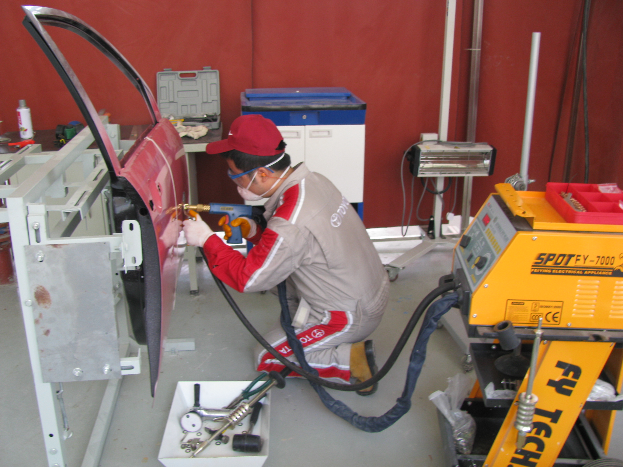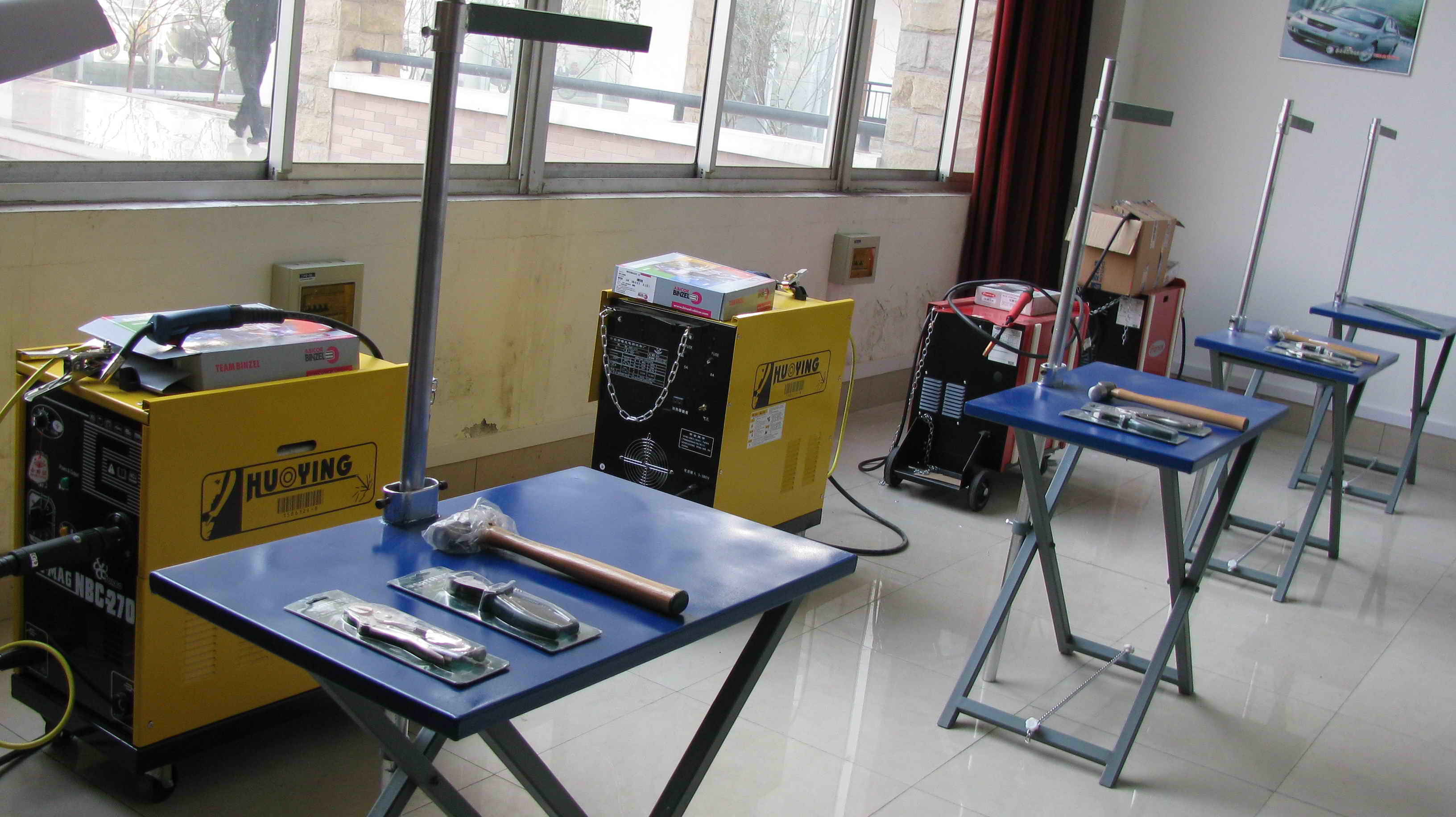 培训中心主要配置了气体保护焊机7台、汽车整形机7台、电阻电焊机2台、平台式车身矫正器1台、钣金手工整形工具14套、等离子切割机1台、调漆机2台,喷烤漆房1个,机械无尘干磨系统10套,螺杆式集中空压站1套,红外线烤灯12台,喷枪15把,各种打磨机20个。