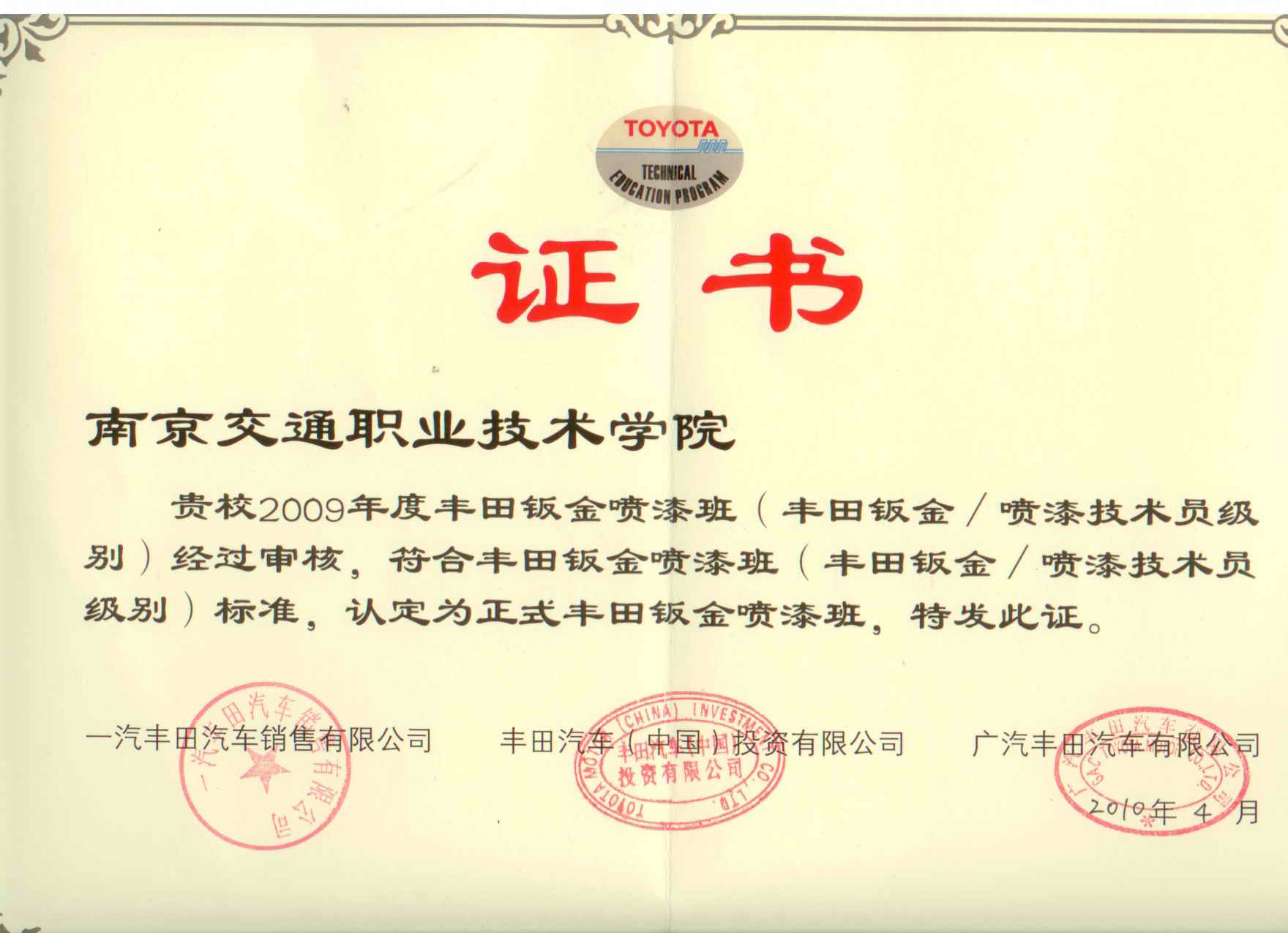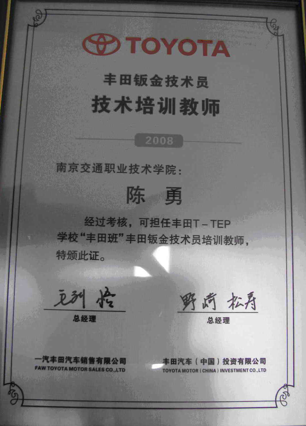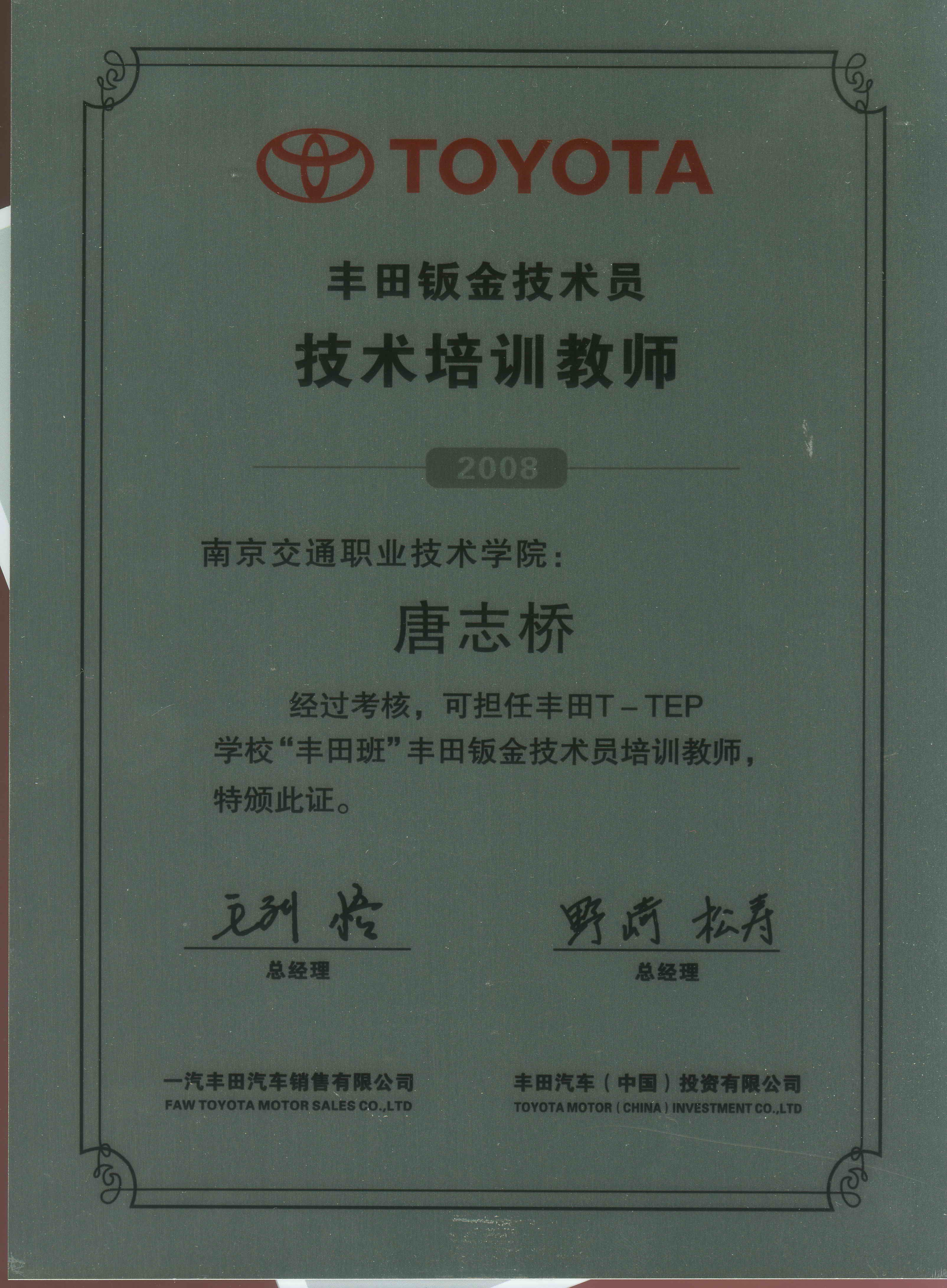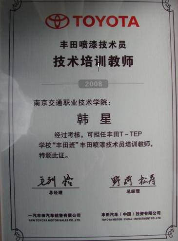 先后有韩星、汤其国、陈勇、唐志桥4名教师到一汽丰田销售公司接受钣金、涂装培训,已获得丰田钣喷培训教师资格。
