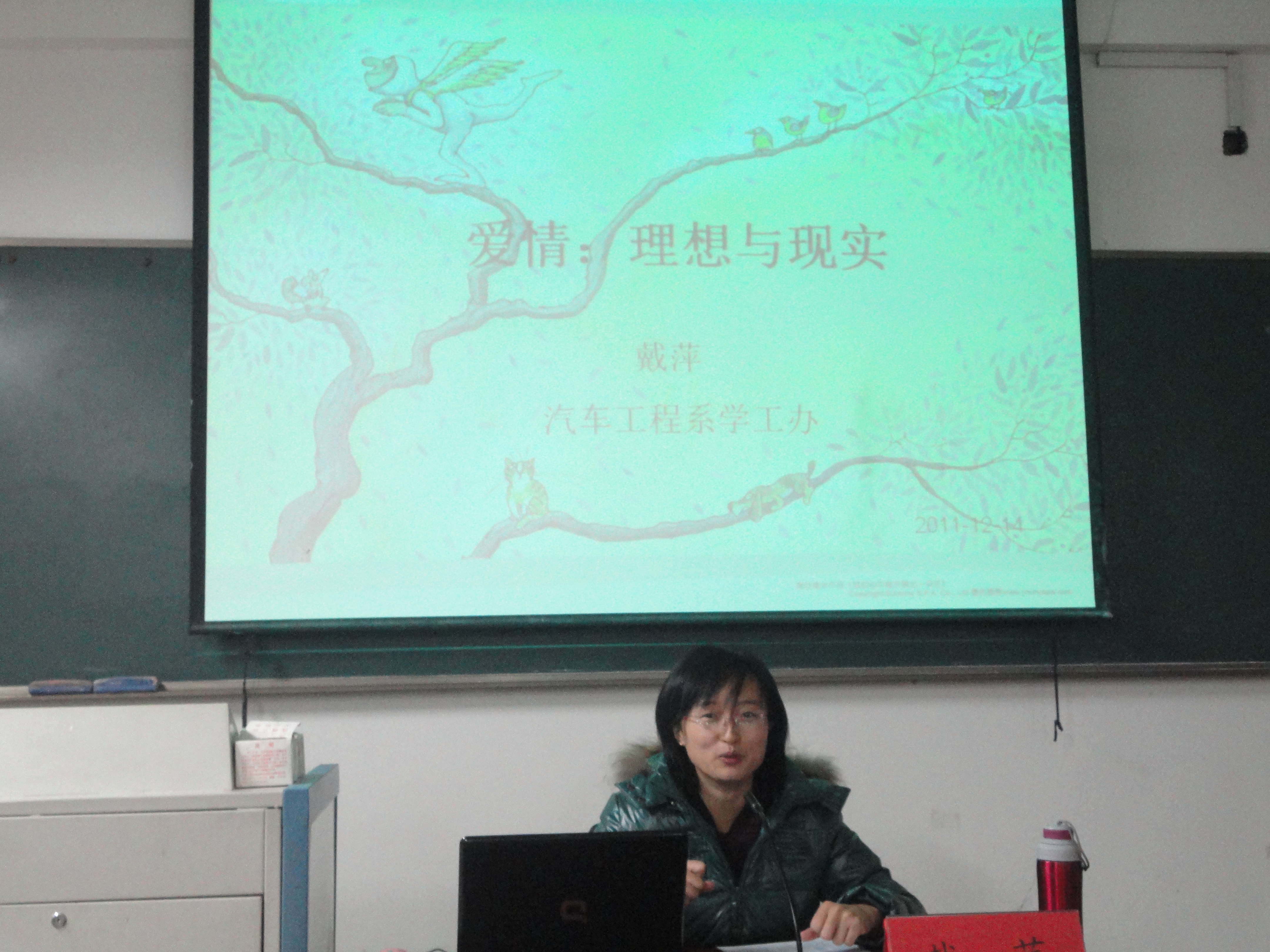 2011年12月14日,汽车工程系辅导员讲堂“爱情:理想与现实”在致远楼303教室举行,由戴萍老师主讲。