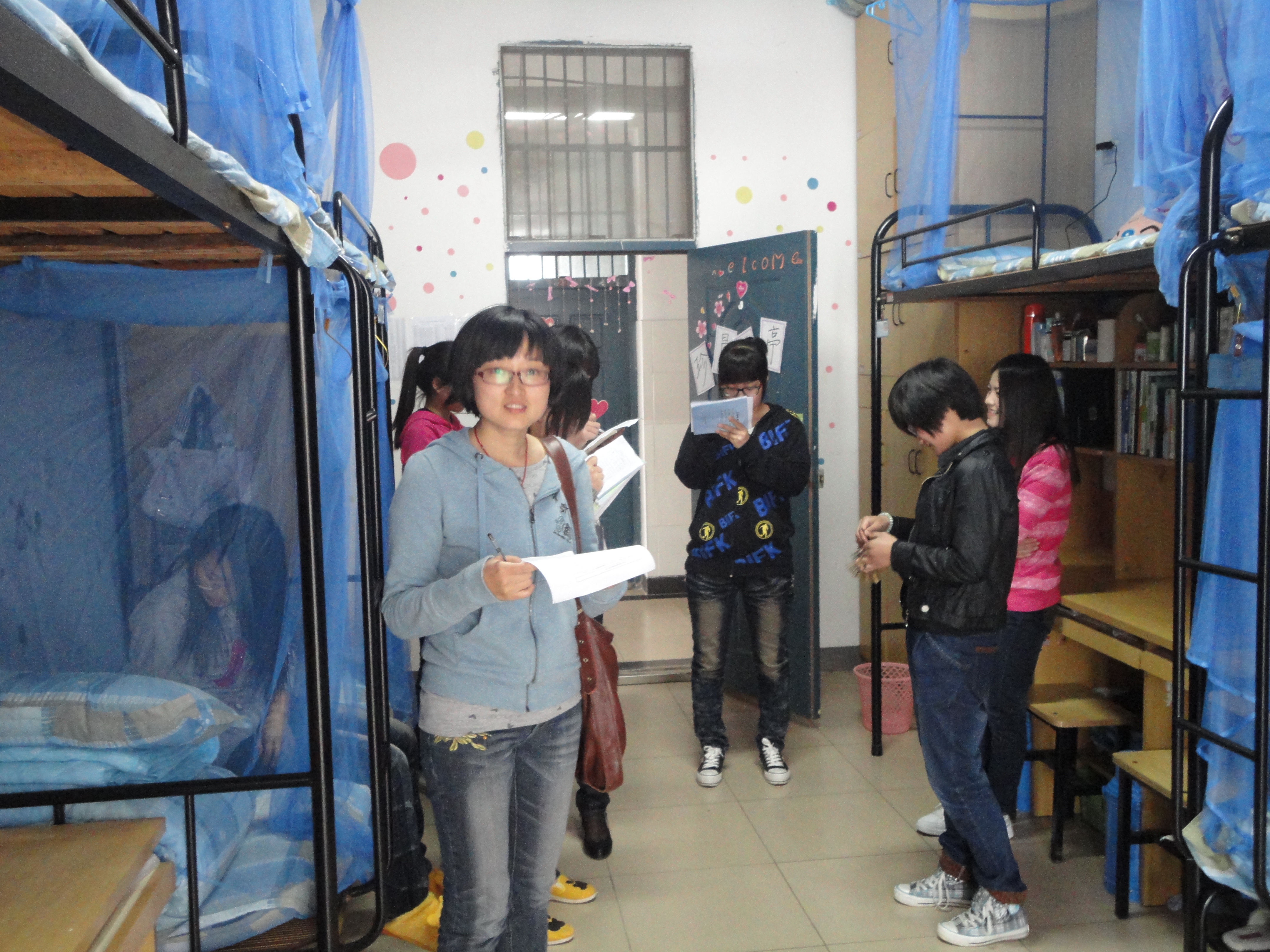 图为戴萍老师带领评分小组对学生宿舍进行评比