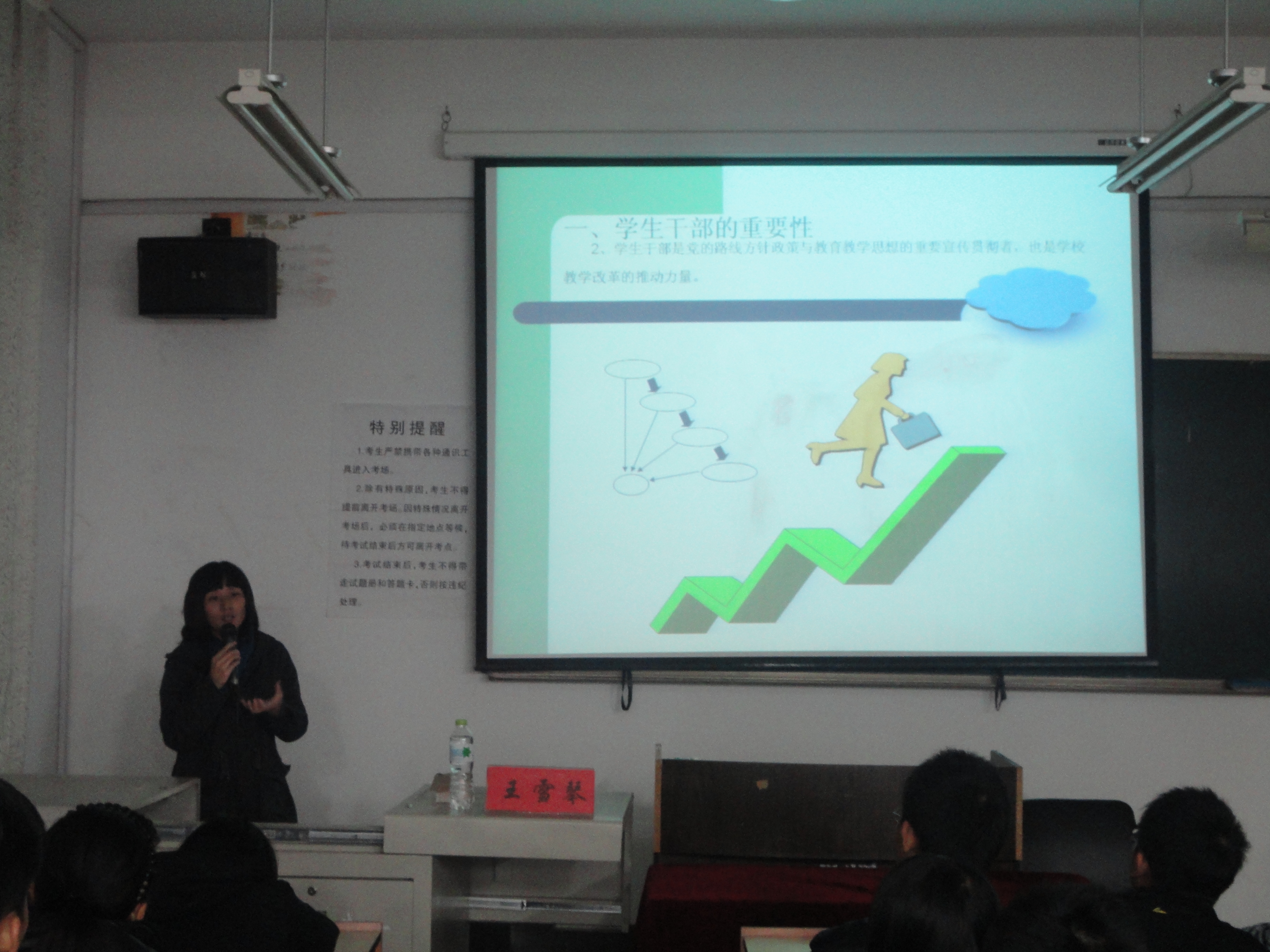 王老师指出学生干部的工作关乎班级的荣誉以及同学们的进步和发展,并围绕如何当好学生干部从学生干部的重要性、角色定位、基本方法及素质等多方面提出指导意见。