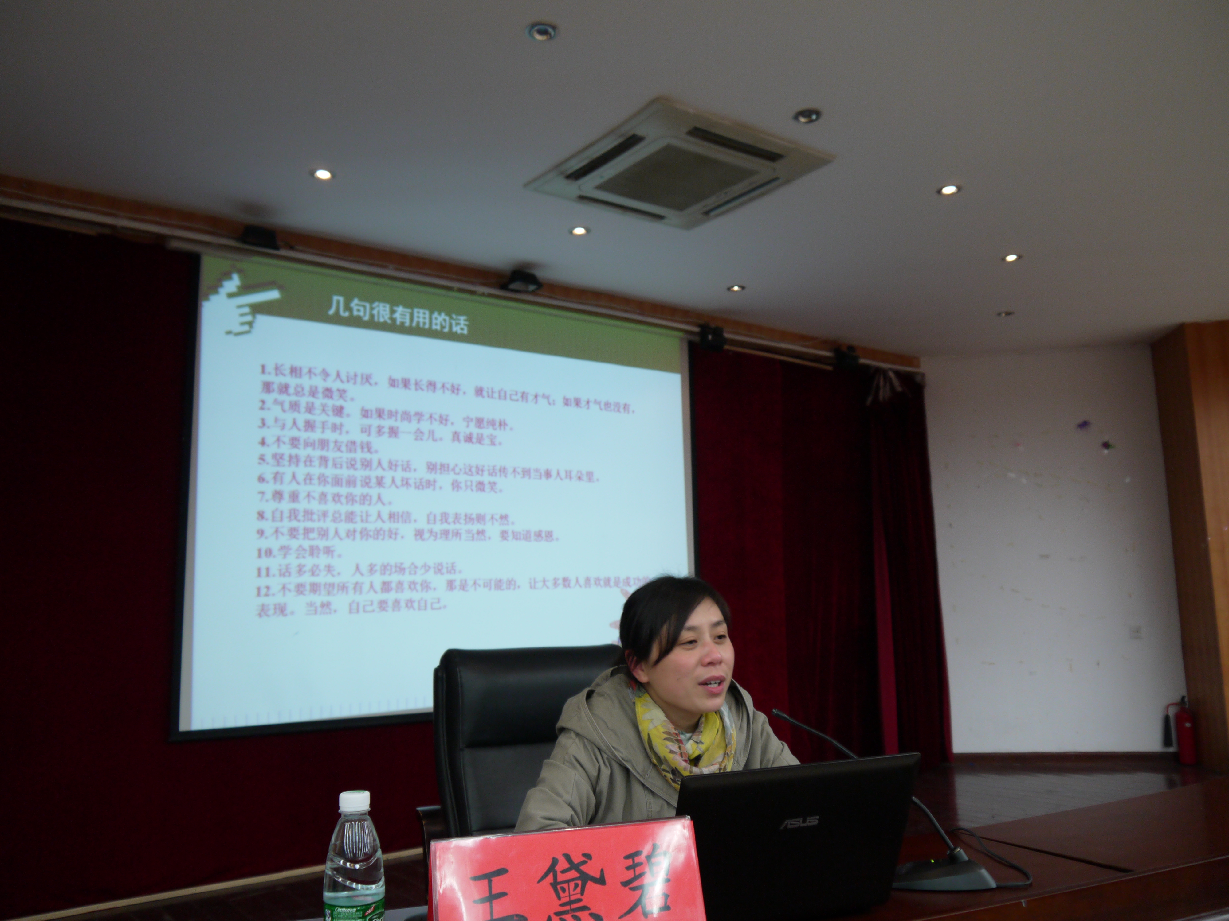 12月10日18:30,南京交通职业技术学院汽车工程学院辅导员讲坛之“走进‘你、我、他’——大学新生人际交往误区及技巧”主题讲座在明德楼报告厅开讲。本次讲座由汽车工程学院王黛碧老师主讲,讲座的内容分为大学新生的人际交往障碍的主要表现,交往误区及原因,怎样改善人际交往、宿舍人际交往技巧等四个方面。