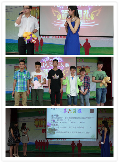 本次比赛分“礼仪服装秀”、“礼仪情景模拟”及“礼仪知识问答”三个环节。来自七个院系的选手身着蒙古服、旗袍、休闲情侣装、晚礼服等七种风格各异的服饰,通过独具特色的礼仪展示和解说诠释各自对其内涵的理解;以家庭、办公室、求职、商务、政务、求职、学校礼仪等为主题,八仙过海,各显神通,通过情景模拟充分展示了当代大学生活泼、创新、富于想象的个性和气质;通过知识问答,充分展现了交院学子聪颖智慧、沉着稳重、团结协作的精神。经过一个多小时的激烈角逐,汽车工程学院获得一等奖——礼仪金星的称号,运输管理学院、建筑工程学院获得二等奖——礼仪海星称号,信息工程学院、路桥与港航工程学院、人文艺术系、机电工程学院获得三等奖——礼仪水星称号。