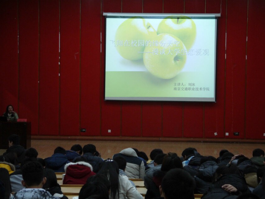 2014年12月18日18:30,南京交院汽车工程学院辅导员讲坛“飞翔在校园的缘分天空——大学生恋爱观漫谈”在大学生活动中心226举行。担任本次主讲的是学工办刘冰老师。