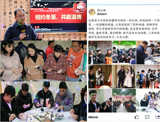 12月21日下午,汽车工程学院在思源堂三楼举办“相约冬至、共叙温情”关爱困难学生活动。学院领导、关工委屠卫星老师、学工办全体辅导员及90余名家庭经济特困学生参加了活动。