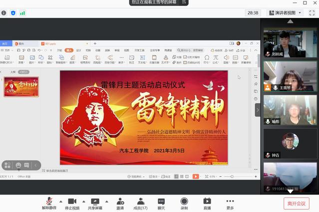 为了学习雷锋同志的先进事迹,在青年大学生中发扬光大“雷锋精神”,进一步推进社会主义核心价值体系建设,深化学院思想政治教育工作,3月5日晚,学院团总支组织全体学生会干部在线上召开了“雷锋月主题活动”启动仪式。会议由团总支书记王雪琴老师主持。