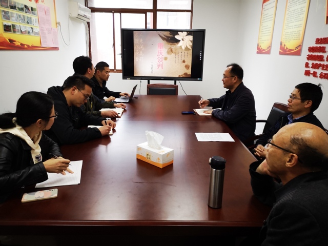 党支部书记胡俊就全体党员“学党史、讲党史”活动作了安排。化永星老师讲述了抗日战争胜利之际,中国共产党和中国国民党两党就中国未来的发展前途、建设大计在重庆进行的一次历时43天历史性会谈,史称重庆谈判。郭伟东老师毛泽东领导的“三湾改编”的故事,从政治上、组织上保证了党对军队的绝对领导,是我党建设新型人民军队最早的一次成功探索和实践,标志着毛泽东建设人民军队思想的开始形成。