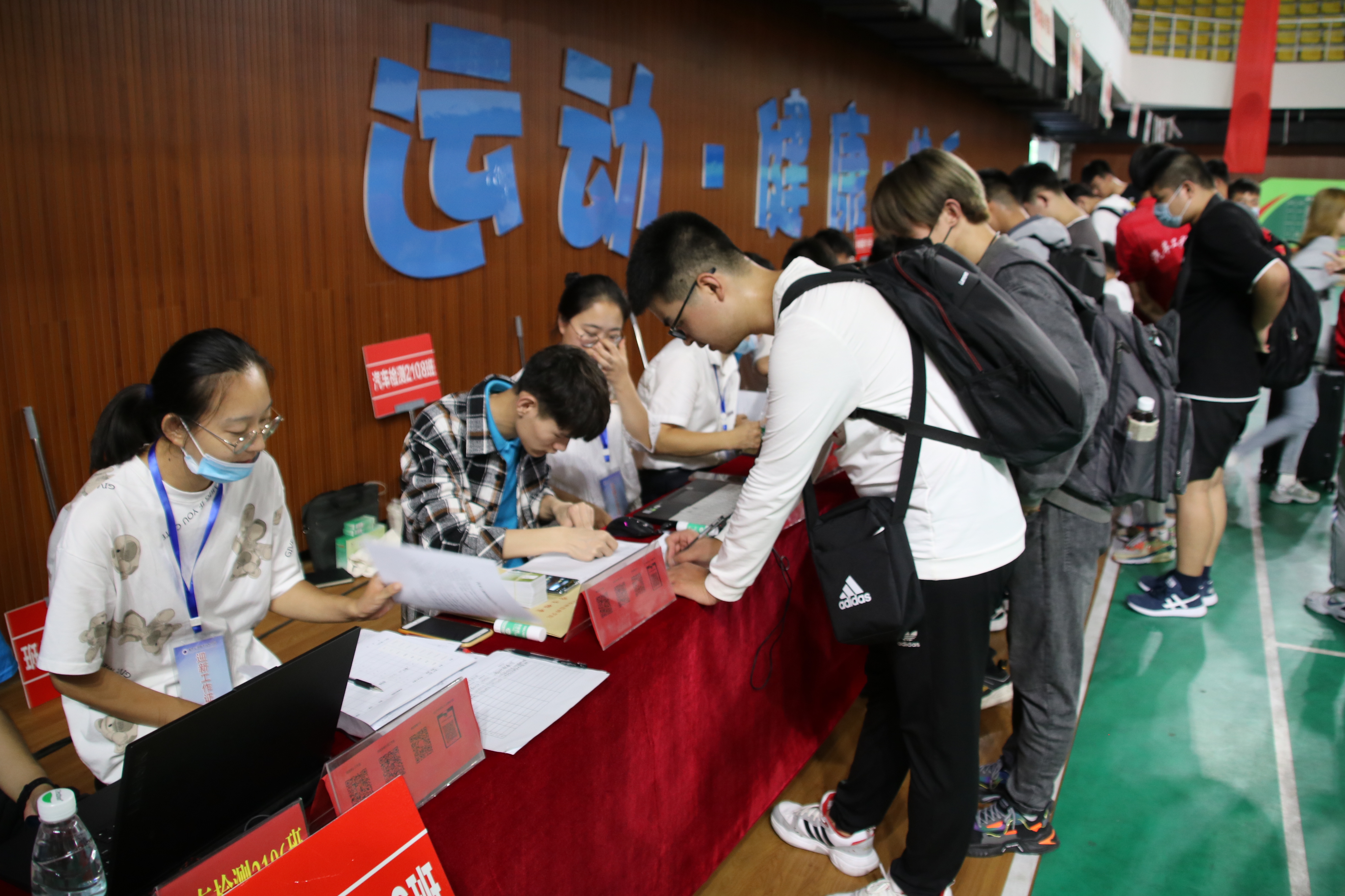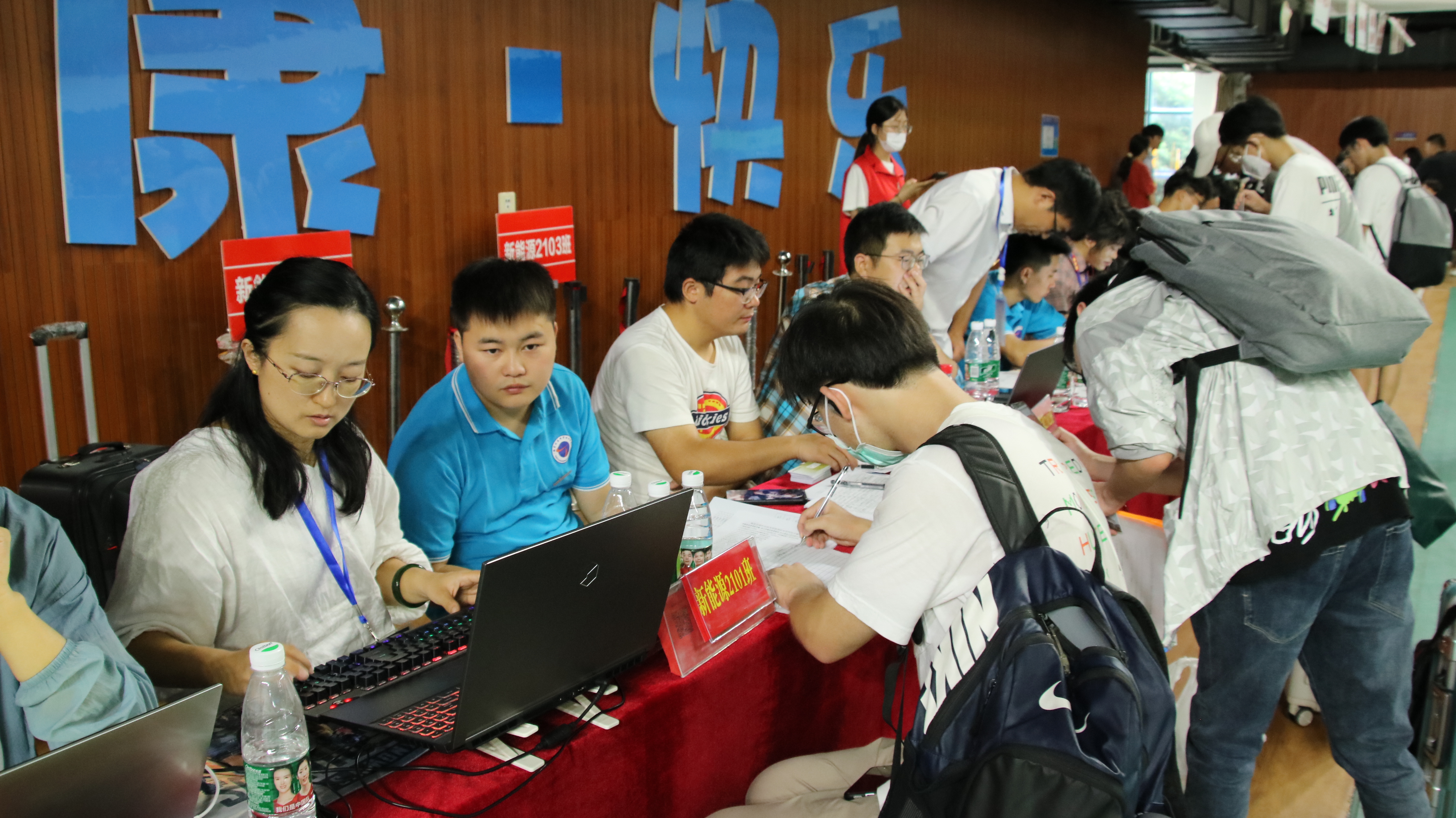 行健馆,班主任和班助在各自班牌位置接待新生,对前来报到的新生进行信息登记,发放校园卡,办理档案接收、团关系转接,叮嘱安全事宜。