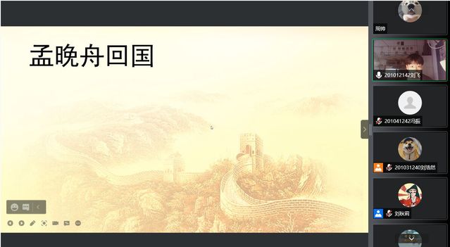 刘飞同学从最近热议的话题“孟晚舟回国”引入主题,讲述了孟晚舟女士自2018年12月1日在过境加拿大温哥华机场时,被加拿大当局应美国引渡要求无理拘押。孟晚舟事件是一起针对中国公民的政治迫害事件,目的是打压中国的高技术企业。今天,实现中华民族伟大复兴进入了不可逆转的历史进程,越是接近民族复兴越不会一帆风顺,越充满风险挑战乃至惊涛骇浪。我们坚信,没有任何力量能够撼动我们伟大祖国的地位,没有任何力量能够阻挡中国前进的步伐!