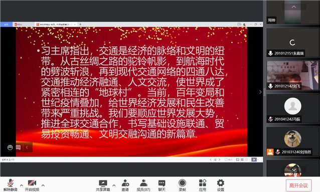 朱嘉瑞同学介绍了国家主席习近平10月14日晚以视频方式出席第二届联合国全球可持续交通大会开幕式,并发表题为《与世界相交与时代相通在可持续发展道路上阔步前行》的主旨讲话。当前,百年变局和世纪疫情叠加,给世界经济发展和民生改善带来严重挑战。我们要顺应世界发展大势,推进全球交通合作,书写基础设施联通、贸易投资畅通、文明交融沟通的新篇章。习主席强调,让我们携手走互联互通、互利共赢的人间正道,共同建设一个持久和平、普遍安全、共同繁荣、开放包容、清洁美丽世界,推动构建人类命运共同体。