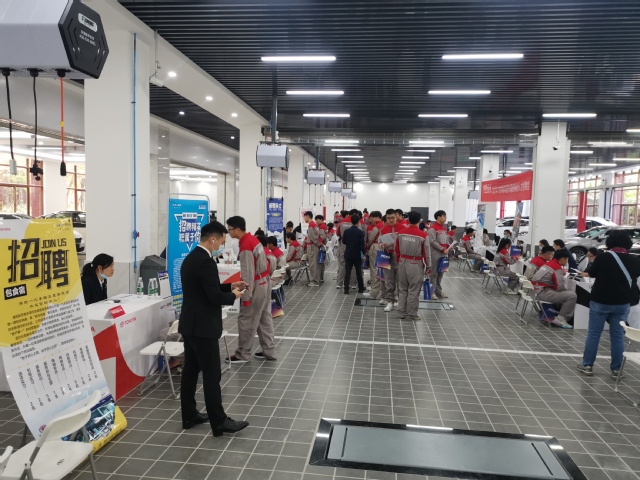 在丰田事务局领导的组织下,此次招聘会共有来自全国一汽丰田及雷克萨斯经销店22家,其中12家采用线下,8家采用线下,共提供了销售顾问、服务顾问、一般维修、钣金喷漆等多个岗位需求,平均一个学生就可以挑选3个岗位。