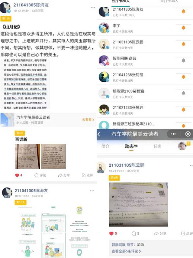 “最美云读者”评比活动是通过阅读和在线打卡的形式,吸引到64余名同学的参与,最终2110413班陈海友等8名同学获得了“最美云读者”。