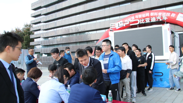 比亚迪直营事业部进行了三元电池、刀片电池的针刺实验,提供了5款比亚迪新能源汽车,开展试乘试驾。招聘会上,比亚迪8家店为毕业生提供了200多个就业岗位,新能源汽车强化班和其他专业学生积极投递简历,与企业面对面进行了交流。