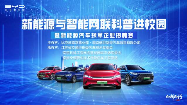 11月3日,由学校工会、汽车工程学院携手比亚迪直营事业部及南京盛世新景汽车销售有限公司等在学校图书馆广场开展了“新能源与智能网联科普进校园暨新能源汽车领军企业招聘会”。江苏省交通行指委汽车技术类专委会秘书长、南京机械工程学会智能网联车辆专委会3位委员、汽车工程学院全体院领导,比亚迪直营事业部第三战区谢国庆副总监和南京8家直营店店长参加了此次活动。