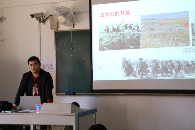 崔康乐同学介绍了“艰苦奋斗、勇于开拓、顾全大局、无私奉献”的北大荒精神。20世纪50年代初,我国十万转业官兵在东北三江平原的亘古荒原上发起了“向地球开战,向荒原要粮”的伟大壮举。半个世纪来,几代拓荒人承受了难以想象的艰难困苦,战天斗地,百折不挠,用火热的激情、青春和汗水把人生道路上的句号划在了祖国边陲那曾经荒芜凄凉的土地上。垦荒英雄们跋山涉水、勇往直前,他们已把生命融入了这片荒原,用青春和智慧征服了这片桀骜不驯的黑土地,实现了从北大荒到北大仓的历史性巨变。