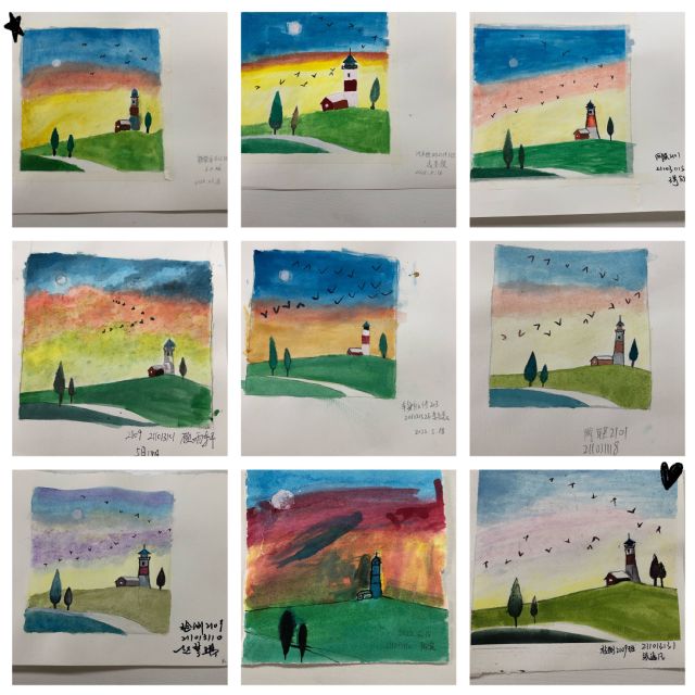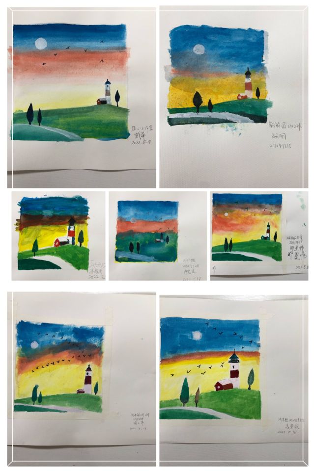 随着手中画笔在水粉纸上的晕染,天空、灯塔、房子、树木跃然纸上,每个天空、灯塔、房子、树木都带有画者意识和无意识的特质,每一次的呈现都是独特的,令人惊奇的。时间在流淌,意识在流动,无意识在呈现,每个同学在这一个半小时,倾注全部心力,收获意外之作。创作完成后,大家一起展示属于自己也属于此刻的独一无二的作品,满心欢喜。