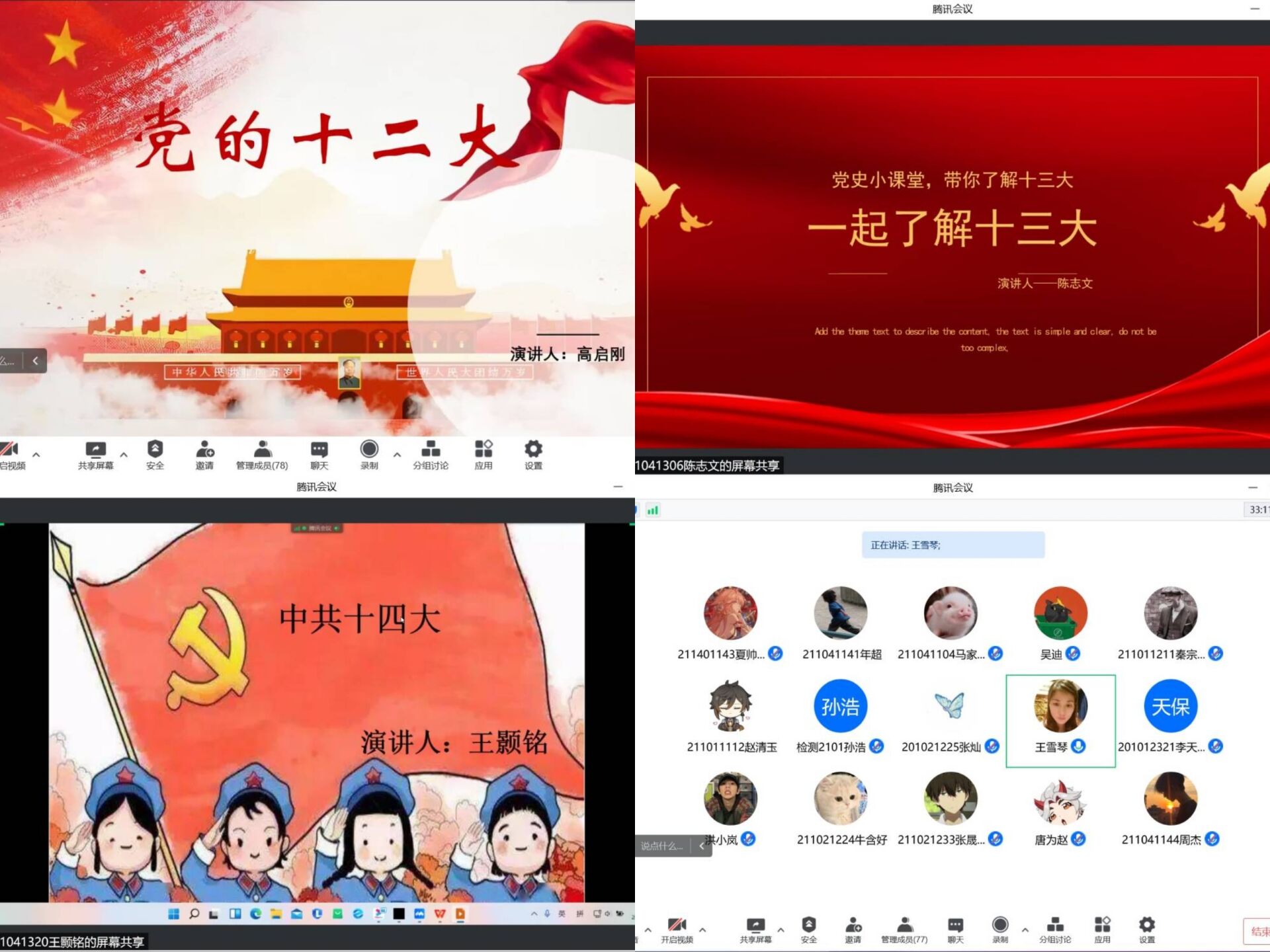 6月9日下午,汽车工程学院团学干部“学历届党代会精神、迎二十大胜利召开”学讲活动在线上顺利举办。新能源2103班的高启刚、陈志文、王颢铭三位同学结合自己的学习,分别宣讲了中共十二大、中共十三大、中共十四大会议精神。