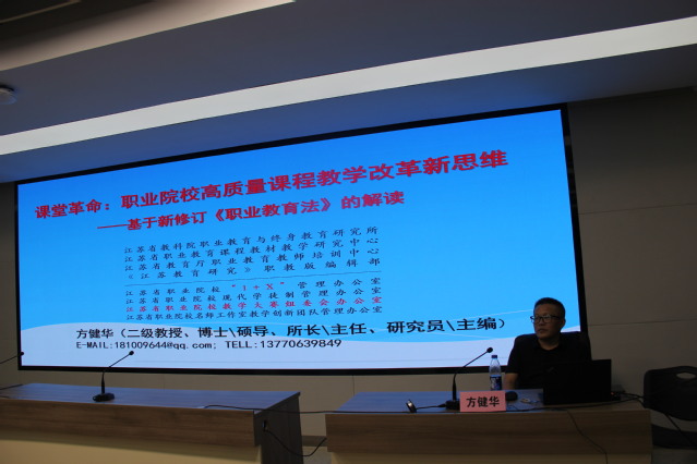 江苏省教育科学研究院职业教育与终身教育研究所所长、江苏省中职教师培训中心常务副主任方健华以“课堂革命:职业院校高质量教学改革新思维”为题,通过对《职业教育法》的解读,分析了职教新时代课程教学改革发展新趋势,指出“三教”改革是当前职业教育质量革命的关键切入点,号召中职教师积极投身教学改革,让职业教育的课堂充满活力。