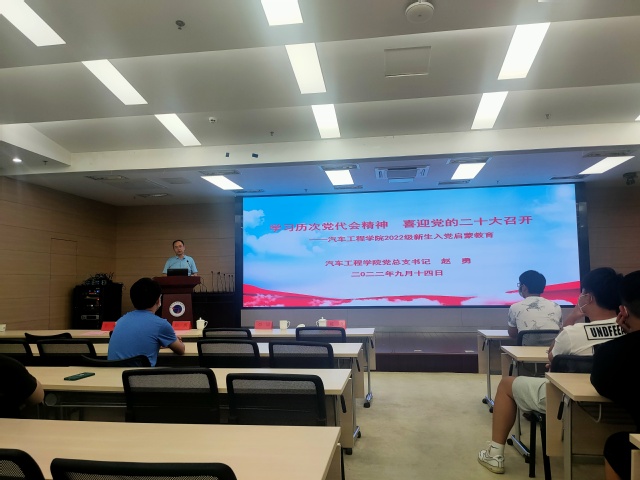 根据学校党委组织部《关于做好2022级新生入党启蒙教育的通知》要求, 9月14日下午,汽车工程学院党总支组织召开了2022级新生入党启蒙教育大会,为新生上好第一堂党课。本次大会采用线上、线下相结合的方式,全体辅导员、2022级班主任以及全体新生参加了学习活动。
