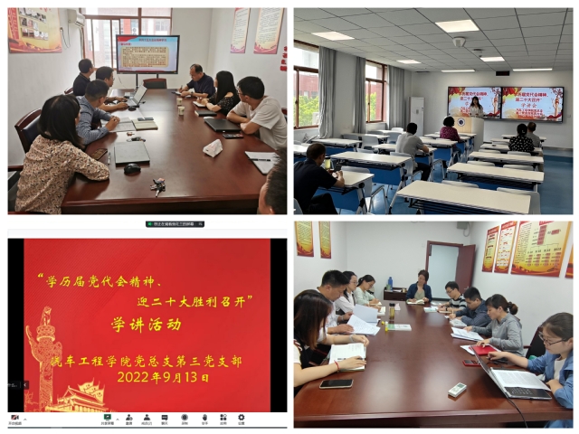 根据学院党总支工作安排,9月中下旬,各党支部分别开展了第五次“学历次党代会精神、迎二十大胜利召开”学讲活动。本次学讲活动聚焦中国共产党第十五次、第十六次、第十七次全国代表大会。第一党支部邱骞、刘静、杜志华,第二党支部刘凯迪、李娜,第三党支部焦红兰,第四党支部孙周分别领学和讲解。