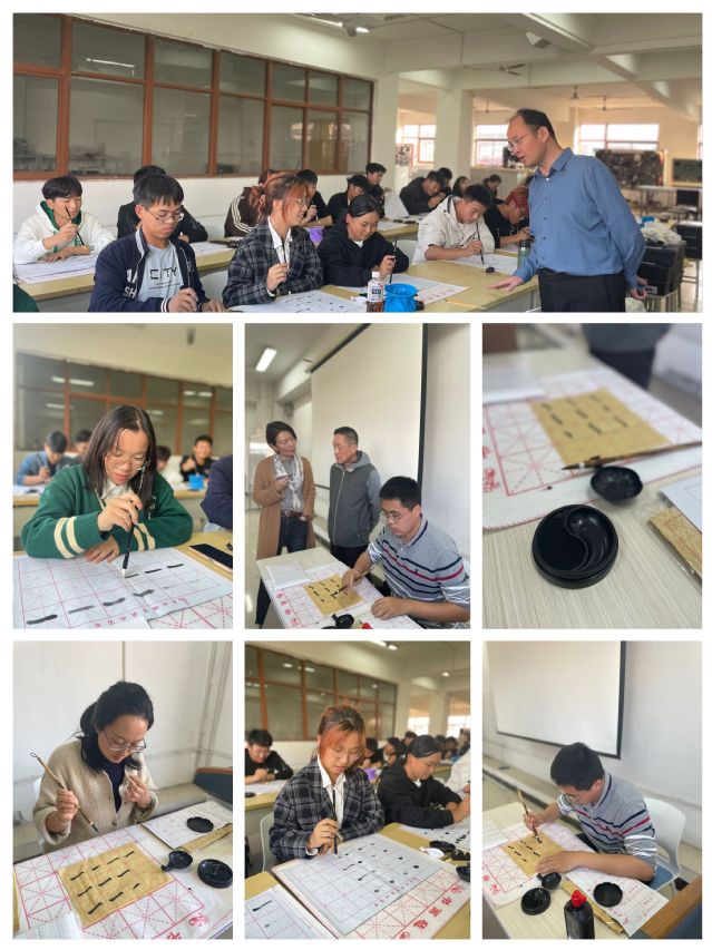 10月13日傍晚,原心工作室在致远楼402开展了第一期书法体验活动。梁原、戴萍两位老师和28名同学参加了此次活动。关工委屠卫星老师,党总支赵勇书记、王琼副书记、学工办王雪琴老师观摩指导。