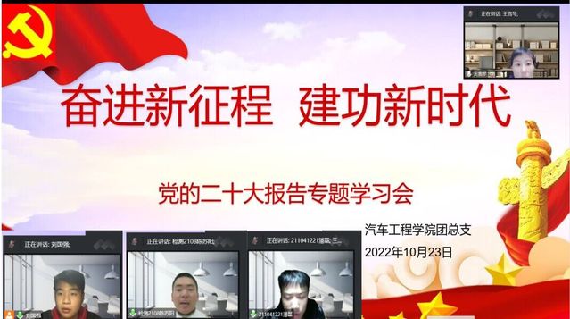为深入学习贯彻落实中国共产党第二十次全国代表大会精神,10月23日晚,汽车工程学院团总支在线组织开展了以“奋进新征程 建功新时代”为主题的党的二十大工作报告学习会。学生会干部、各班级班长和团支部书记100余人参加了学习会。会议由团总支书记王雪琴主持。