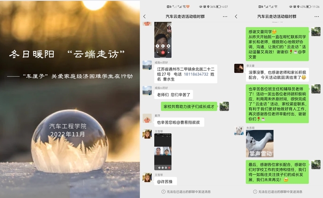 为进一步加强家校共育,提升资助育人工作实效,11月18—19日,汽车工程学院组织开展了困难学生家庭“云走访”活动,组织班主任、辅导员、关工委老师及第四党总支全体党员对15名2022级特困学生家庭进行线上走访。