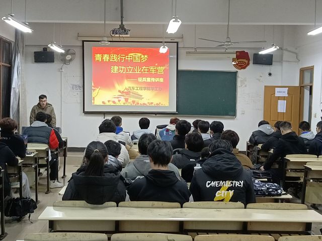2023年征兵工作已经启动,为了做好学院征兵工作,12月4日晚,汽车工程学院在致远楼427教室采取线上线下相结合的方式举办了征兵政策宣讲活动。活动由学工办辅导员朱吉顺老师主持和宣讲,线下40多位、线上70多位同学和家长参加了讲座。讲座持续约一个半小时。
